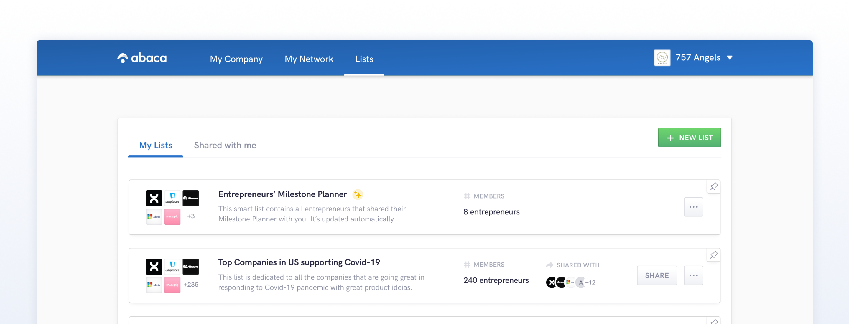 - Accelerators and other entrepreneur support organizations (ESOs) can use Lists to move companies through a selection process and then share cohorts or alumni with mentors and investors.