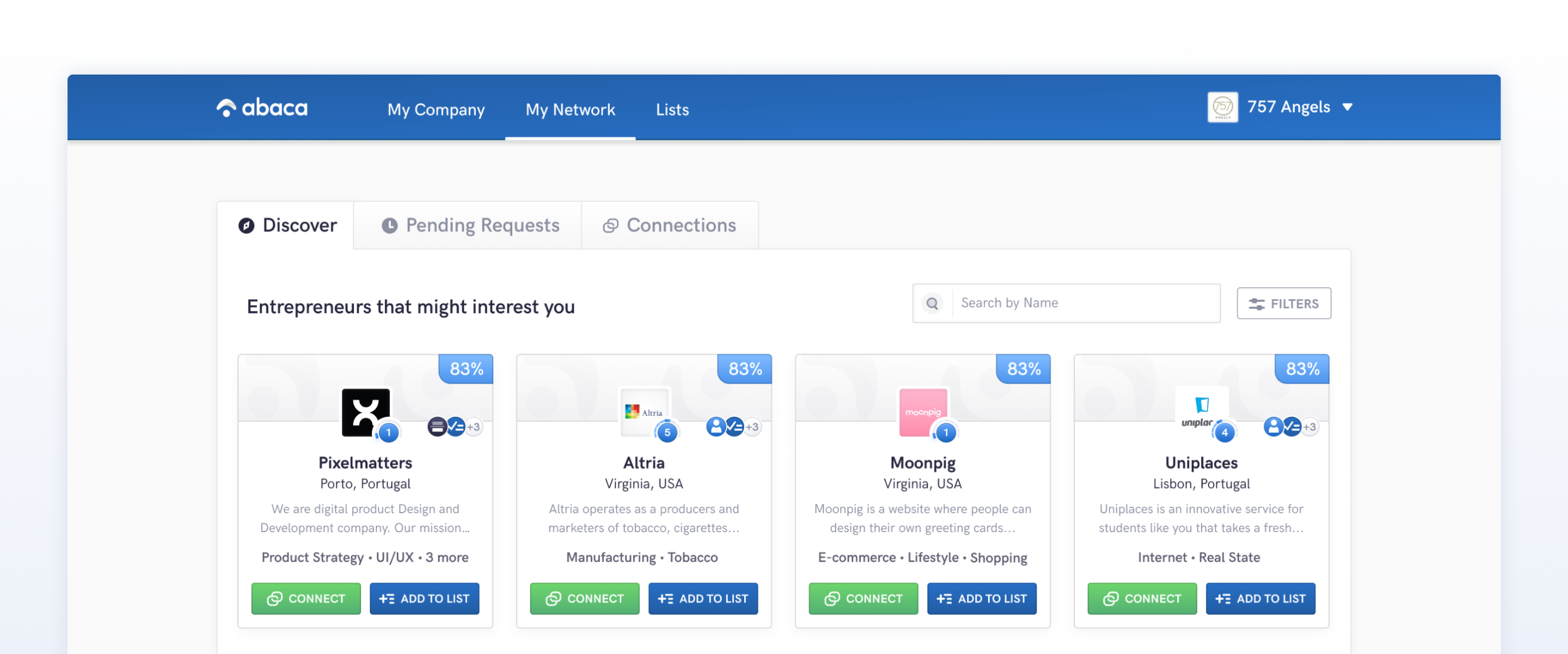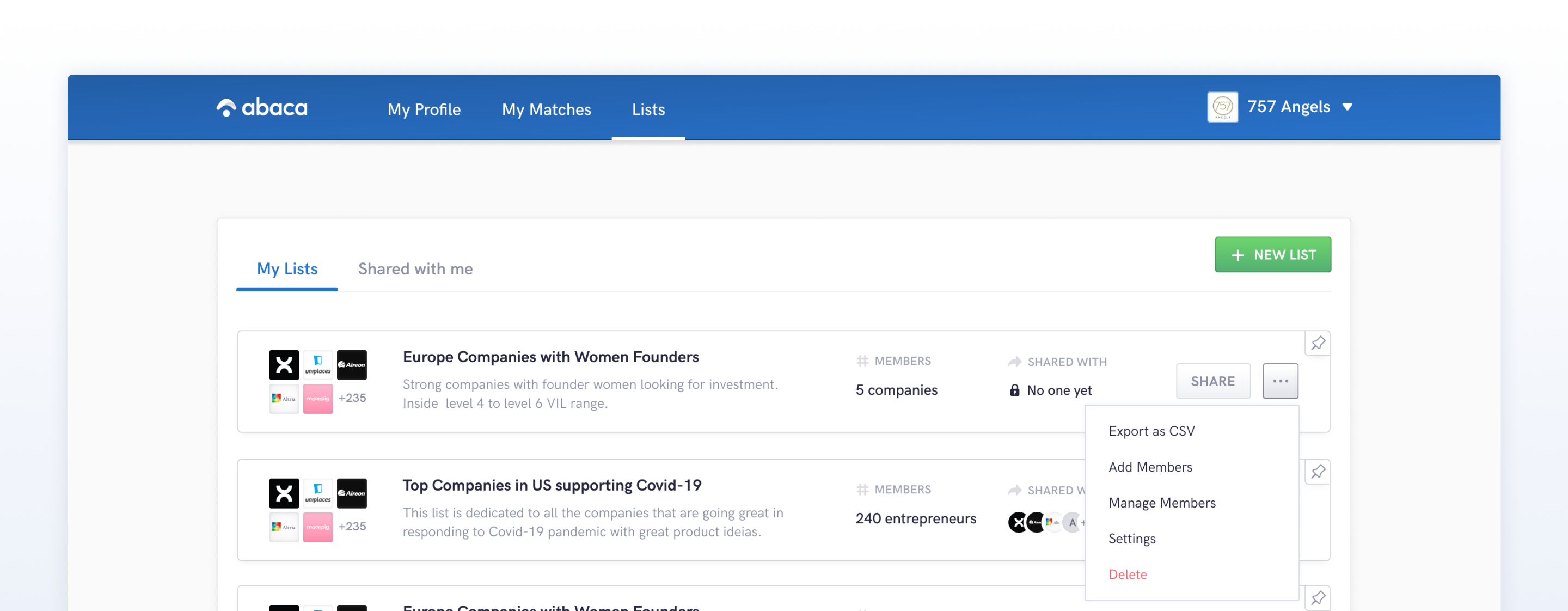 If the recipient of a List you’ve shared is also on Abaca, each company will have a match score based on the recipient’s criteria, making it easy for them to identify the best fits for their particular interests.